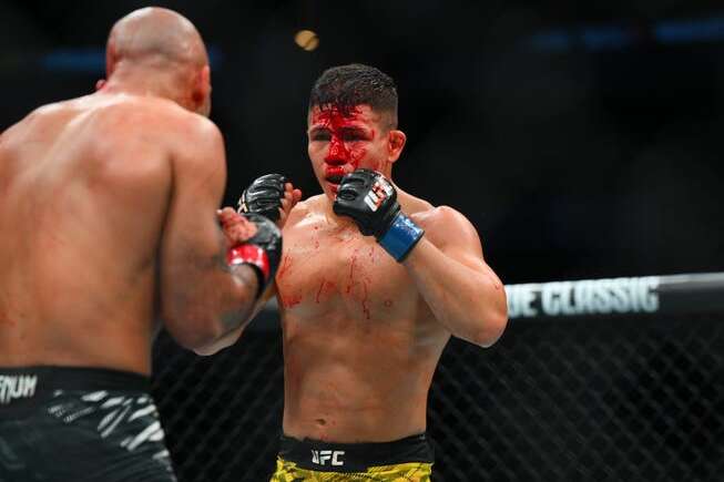 SYDNEY, AUSTRALIA - FEBRUARY 01: (R-L) Tallison Teixeira of Brazil punches Tai Tuivasa of Australia in a heavyweight fight during the UFC 325 event at Qudos Bank Arena on February 01, 2026 in Sydney, Australia. (Photo by Jeff Bottari/Zuffa LLC)