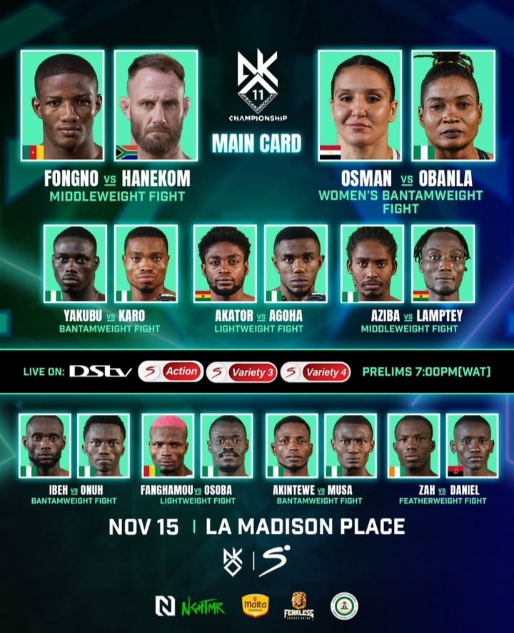 Jordan Fongno pulls off stunning upset over Chad Hanekom at AKO 11. The African Knockout promotion returned to Lagos with AKO 11, headlined by a thrilling middleweight matchup between Chad “Superman” Hanekom of South Africa and rising Cameroonian contender Jordan Fongno. The event took place at La Madison Place, and brought high-level professional MMA action to the Nigerian capital.
