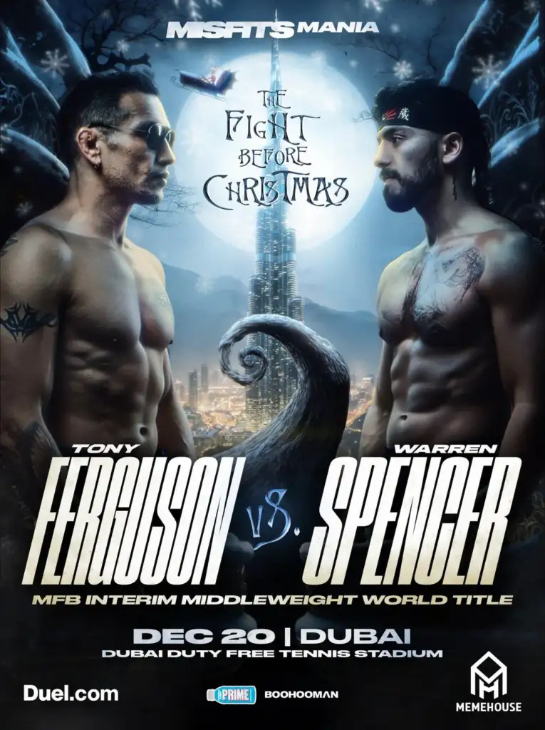 Fresh off his TKO win over Salt Papi in August, Tony Ferguson returns on Dec. 20 to defend his Misfits Boxing interim middleweight title against Warren Spencer at Misfits Boxing: The Fight Before Christmas. The showdown goes down inside the Dubai Duty Free Tennis Stadium.