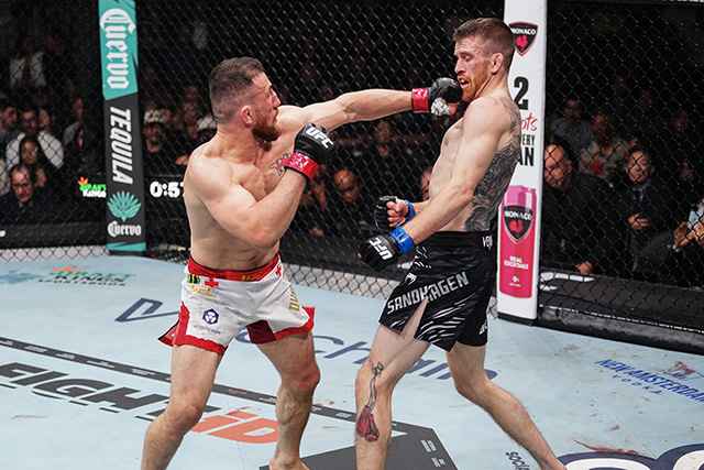 Round four saw Merab open with another leg kick as the two traded strikes. Less than a minute in, the champion once again took Sandhagen down and pinned him on the cage. After returning to the center, Sandhagen found a brief moment of success, landing punches that drew a reaction from the crowd. However, the shots had little effect on Dvalishvili, who answered with another takedown. From there, Merab smothered Sandhagen on the mat and maintained top control until the end of the round.