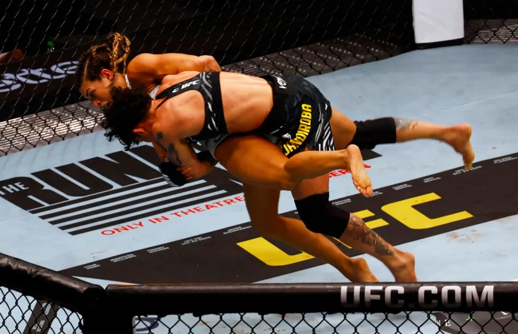 Round 4 had Dern worked behind her jab and landed several clean strikes while Jandiroba countered with her own left and right hands. Both stayed active on the feet until Dern pressed forward looking for a takedown, but Jandiroba defended. After another striking exchange, Jandiroba scored a double-leg takedown, though little happened on the ground and Dern stood back up. Jandiroba landed a quick 1–2 before Dern secured her own takedown to close the round, doing just enough to edge it.