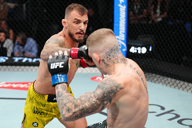 In the clinch, Moicano landed a solid knee to the body. Duncan managed to break away, but he was clearly working hard to escape the constant pressure and grappling exchanges. Moicano’s jab was sharp, landing clean, and he followed it up with another strong knee in the clinch. Moicano continued to read Duncan well, checking more leg kicks and landing his jab at will, then mixing in a slick left hook that connected. In the final 10 seconds of round one, Duncan grazed him with a body kick, but it wasn’t enough.